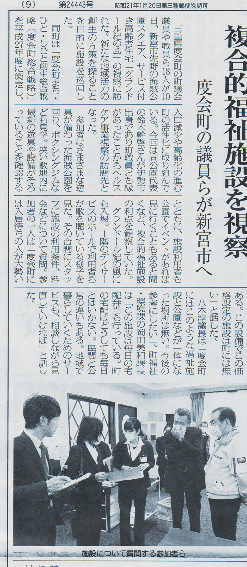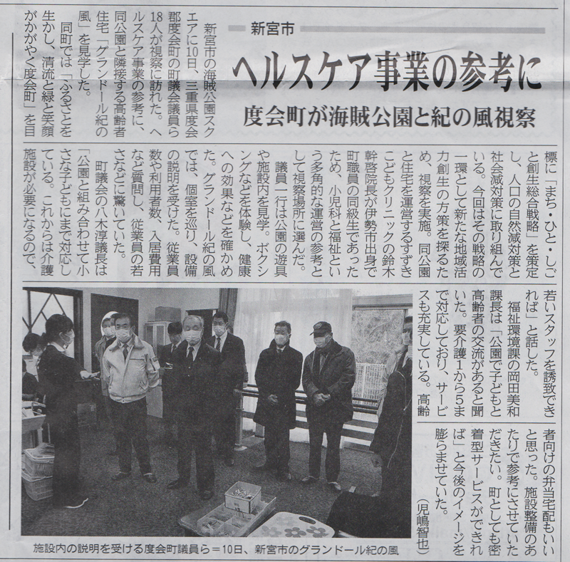 度会町の議員らが海賊公園と紀の風を視察した模様が新聞に掲載されました。